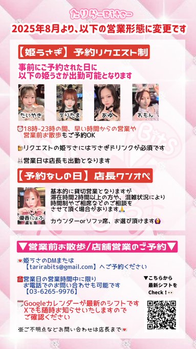 固定たりら-Bits-@新宿🐰シャンコがあるバニーコンカフェ@Tarira_Bits·7月24日🗓️最新シフト https://calendar.google.com/calendar/embed?src=tarirabits%40gmail.com&ctz=Asia%2FTokyo… 🍺遠隔 http://tarirabits.net/?page_id=275 📱TikTok(ほぼ毎日配信‼️) http://tiktok.com/@tarirabits 👑たりらび3周年記念👑 姫うさLINEスタンプ販売‼️ https://line.me/S/sticker/30992080/?lang=ja&utm_source=gnsh_stickerDetail… 💌tarirabits@gmail.com ☎️03-6265-9976(営業中のみ対応🆗)引用たりら-Bits-@新宿🐰シャンコがあるバニーコンカフェ@Tarira_Bits·7月24日※追加情報※ 🔴営業形態変更のお知らせ🔴 🎀姫うさぎ▶︎予約制 🎀予約なしの日▶︎店長ワンオペ営業 とさせて頂きます🍀 詳細は画像をご覧ください👀 ご予約日&ご希望姫うさを DMまたはtarirabits@gmail.comへ 事前にご連絡ください💌 🗓️最新シフト https://calendar.google.com/calendar/embed?src=tarirabits%40gmail.com&ctz=Asia%2FTokyo… ☎️03-6265-9976447,143