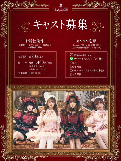 ビスクドール🥀コンカフェ 歌舞伎町@bisquedoll_info·୨୧┈┈┈┈┈┈┈┈┈┈┈┈┈┈┈┈┈┈┈┈┈┈୨୧ 🥀Bisquedoll キャスト募集🥀 Bisquedoll(ビスクドール)とは 着せ替え人形✖洋館がテーマのコンセプトカフェ👗 活動時間は18:00〜25:00の間で調整可能です🕰 詳細は画像内のQRコードより💭 求人用LINE公式アカウントへご連絡ください✉ ͗ ͗さらに表示391,373