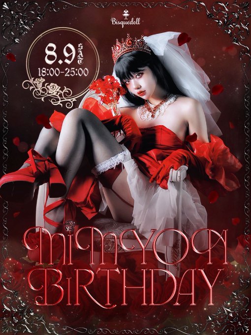 ビスクドール🥀コンカフェ 歌舞伎町@bisquedoll_info·【2025.08.09.sat】 『MiMYON』𝐁𝐈𝐑𝐓𝐇𝐃𝐀𝐘🍷🤍 🕰18:00~25:00 ✅詳細&予約サイトはこちら http://chiroru.store/mimyon2025bd4122,092
