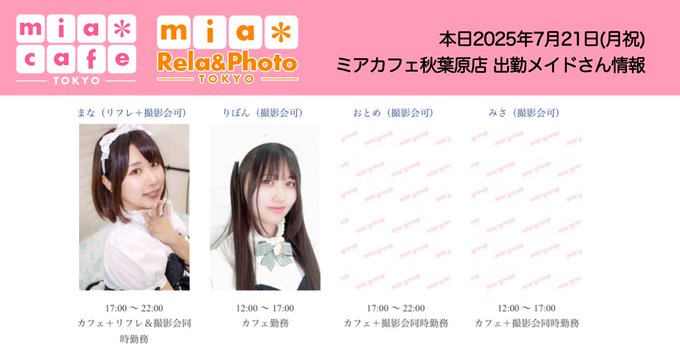 【公式】 秋葉原メイドカフェ ミアカフェ秋葉原店 🌸 メイドリフレ 撮影会 ミアリラ&フォト東京店@mia_group·👑本日(月祝)の総合案内👑 🎀ミアカフェ秋葉原店🎀 🍀本日12:00〜22:00オープン🍀 🎀ミアカフェ山梨店🎀 🍀本日18:00〜22:00オープン🍀 🎀ミアカフェ浜松店🎀 🍀本日17:00〜21:00オープン🍀 🎀ミアカフェ静岡店🎀 🍀本日17:00〜21:00オープン🍀 #メイドカフェ35460