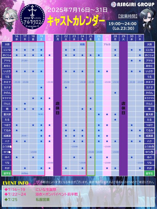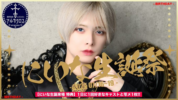 固定異世界迷宮メンズコンカフェ『アルカクロス』✝️朝霧グループ@arcacross_cafe·⚔️7月後半シフト⚔️ 【ℹ️営業時間変更のお知らせℹ️】 7/16より19:00-24:00 【🎉にいな生誕祭🎉】 7/16.17.18.19 【🎂生誕期間 来場特典🎂】 ・好きなキャストと1枚写メ📸無料! ※来店頂いた全てのお客様対象です 【浴衣×ポンパイベント前半‼️】 22.23.24 【特典】 ポイカ2倍‼️ 【定休日】さらに表示和装メンズコンカフェ『朝霧』🎎さんと他2人993,187