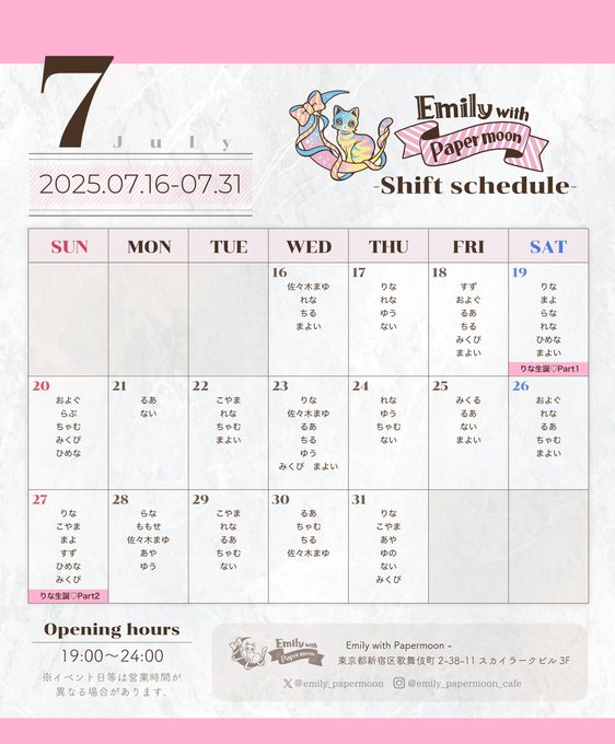 固定🌕Emily with Paper moon🌕【コンカフェ】新人キャスト募集中🐱@emily_papermoon·🌺7月後半シフト🌺 19日 りな生誕イベント🎂Part1 27日 りな生誕イベント🎂Part2 ご新規様限定のお得な特別メニューもご用意しております🐱🌙 ぜひあそびに来てくださいね♡ 💎新人キャスト募集中💎 公式LINE▶️http://lin.ee/sLnu0O2 求人アカウント▶️@emily_recruit_664,833