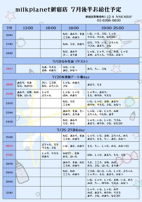 固定【みるぷら】milkplanet【コンカフェ】@milkplanet_cafe·🍼milkplanet🍼 7月後半お給仕&イベント予定 ✔19日るか生誕ゲスト🎂 ✔️20日水族館デート服🪼🐬 ✔️25~27日浴衣👘 ♡ 🌟毎週日曜新規の方 新規のお友達連れてきてくれた方 1時間500円飲み放題❕ 皆様のご来店お待ちしております!✨ #歌舞伎町 #コンカフェ174,228