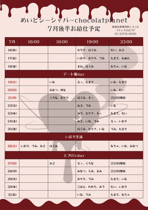 固定めいどシーシャchocolatplanet🍫@chocolatplanet_·🍫ショコプラ7月後半お給仕予定 ❤️19日デート服イベント❤︎ 💭29日いおり生誕イベント🎂 ❤️27日エプロンイベント🍳 🌸オープンから1時間以内にご来店でシーシャ1台2200円✨ ◎お給仕、イベント予定は変更になる場合がございます お待ちしております✨112,140