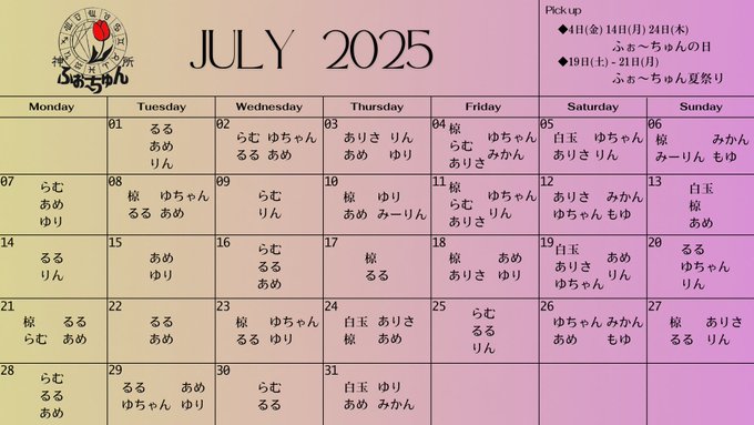 固定神所ふぉ~ちゅん【新宿歌舞伎町コンカフェ】@fortune_concafe·🌷7月後半の #神所ふぉ〜ちゅん🌷 ◆24日(木) ふぉ〜ちゅんの日⛩️ ◆19日(土) - 21日(月・祝) ふぉ〜ちゅん夏祭り2025🍉 皆さまのご帰宅、心よりお待ちしております❣ #新宿 #歌舞伎町 #コンカフェ662,073