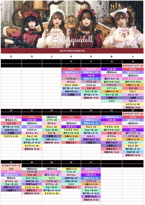 固定ビスクドール🥀コンカフェ 歌舞伎町@bisquedoll_info·【7月後半🥀キャストシフト】 🥀♥️🥀♥️🥀♥️🥀♥️ 19日、26日 チロルバースデー 27日 りみバースデー 🥀♥️🥀♥️🥀♥️🥀♥️11134,199