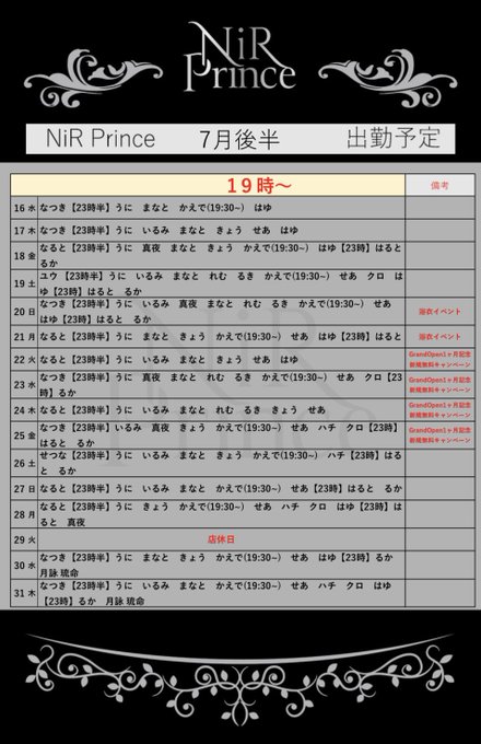 NiR Prince@NiR_Prince_·NiR Prince 7月後半シフトです✨ 20日、21日は浴衣イベント🎐 22日〜25日はGrand Open1ヶ月記念として新規のお客様は無料キャンペーン㊗️🎊 皆様のご来店お待ちしております🎵624,167