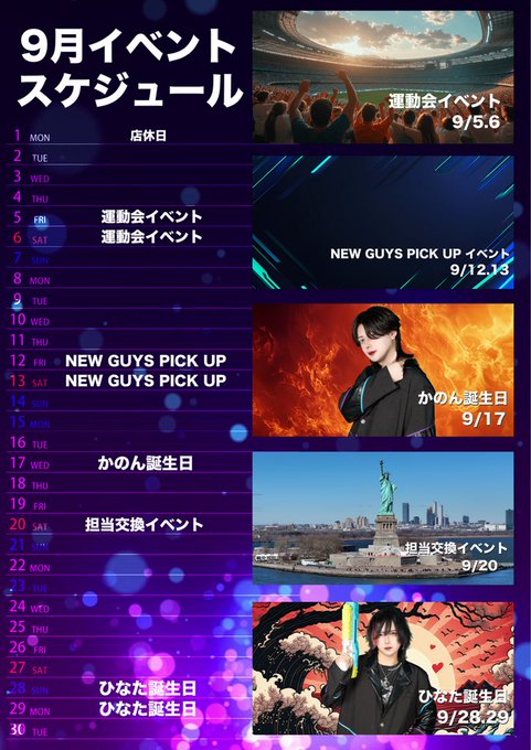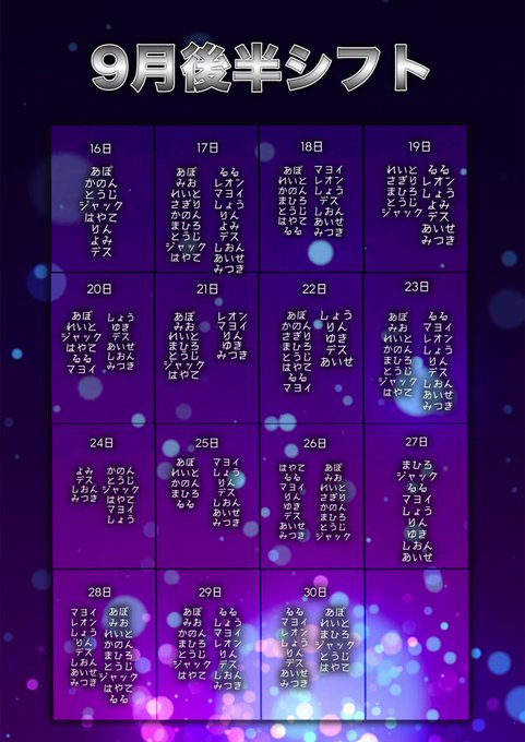 固定CYBER Eeliaas@cyber_eeliaas·🧬9月後半シフト&イベントスケジュール🧬 ◇9/17 かのん誕生日 ◇9/20 担当交換イベント ◇9/28.29 ひなた誕生日3598