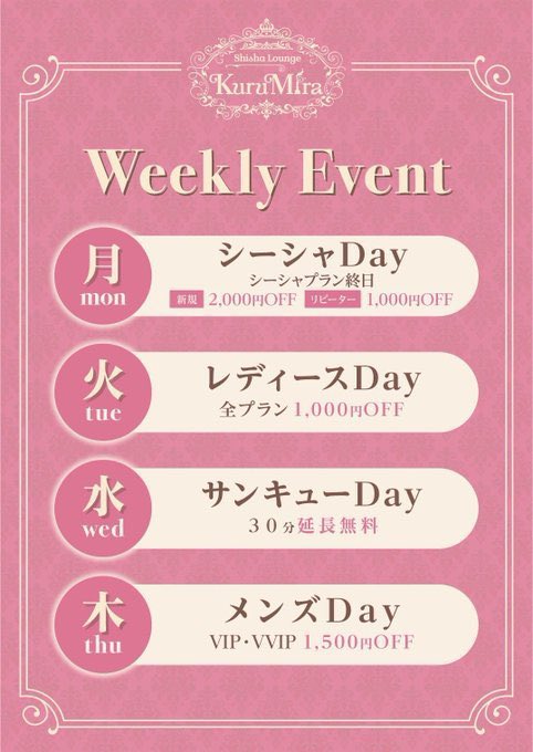 新宿・歌舞伎町 KuruMiraKuru Mira(くるみら)歌舞伎町シーシャコンカフェさんがリポストちるあ🦋🫧KuruMira@chirua_kurumira·おきゅいん!18-22時🦋🤍 本日シーシャDay🫧 新規の騎士様は2000vpオフ リピ騎士様は1000vpオフ お得にシーシャ吸えるのでオーダーしてみてくださいな🐰🎀 ご来殿お待ちしております💫 遠隔のご支援はこちらから💖 http://kurumirage.base.shopKuru Mira(くるみら)歌舞伎町シーシャコンカフェ12103