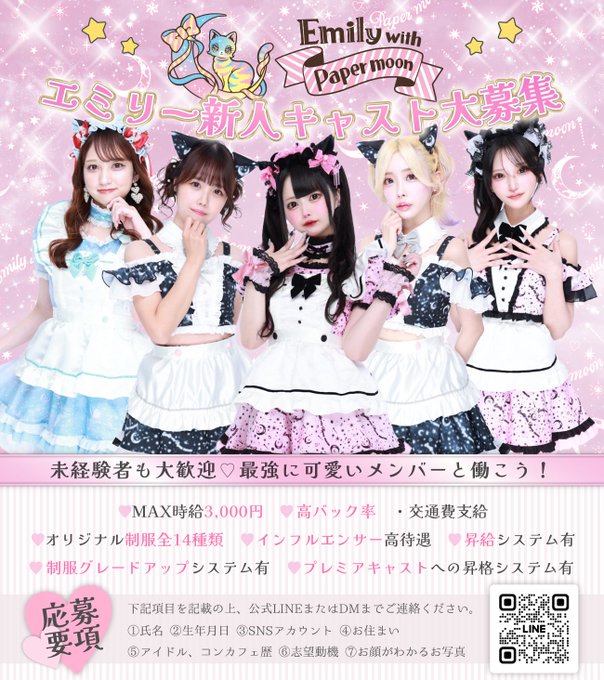 新宿・歌舞伎町 Emily with Paper moon🌕Emily with Paper moon🌕【コンカフェ】新人キャスト募集中🐱@emily_papermoon·\ 🎀新人キャスト大募集🎀/ ✨ついに“新制服8種類”追加! 可愛いが止まらない、過去最大の制服ラインナップ💐 自分だけのスタイルで働ける“進化した猫耳コンカフェ”へ——。 💎 時給MAX3,000円+高額バック完備 💎 制服は全14種類に! ランクUPでカスタムOK 💎 週1〜OK/終電までOK/未経験歓迎さらに表示2346