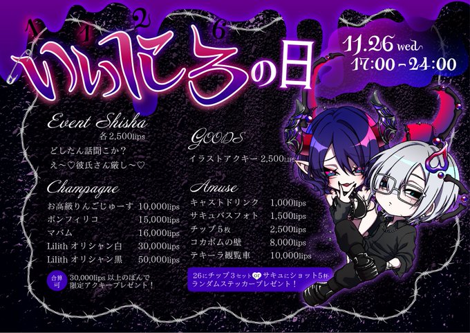 新宿・歌舞伎町 IDOLilith~アイドリリス~IDOLilith〜アイドリリス〜@IDOLilith·11/18(火)悪魔ちゃん💜 😈みるきぃ@_miyuki0726_ 😈えま@_em_chi 😈つかさ@give_a_meow 是非お越しください💜 遠隔はこちら⇒ http://idolilith.base.shop8197