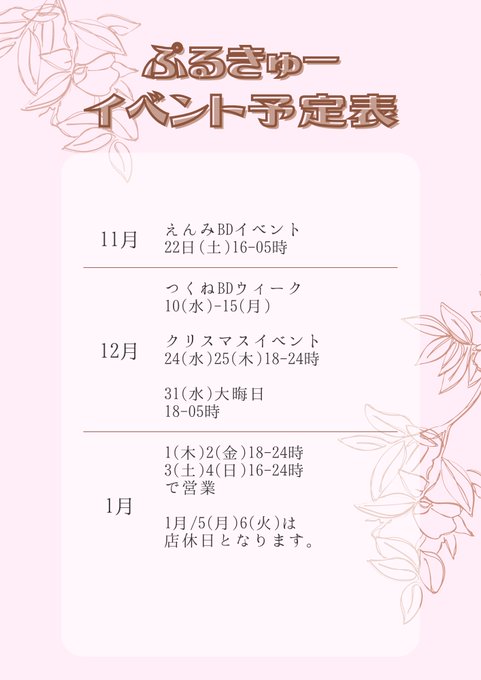 新宿・歌舞伎町 メイド&サブカルカフェバーぷるきゅー固定メイド&サブカル カフェバー ぷるきゅー@purukyu·11月~1月までのイベント予定です✨ 予定変更や追加がある可能性がございますのでご了承ください。 皆様のご来店お待ちしております!11347