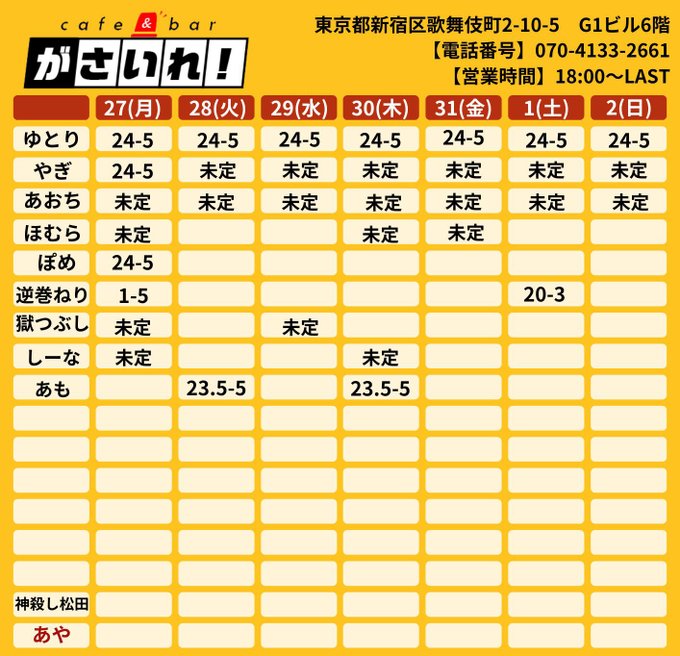 新宿・歌舞伎町 がさいれやぎ@baa_baa_yagi·5時間今日明日ぃません...明後日24-引用新宿歌舞伎町🚨脱力系問題児更生コンカフェ🚨Cafe&Barがさいれ@gasaile·11時間10/27(月)出勤 24:00~ 👮♀️ゆとり@satori_1201 👮♀️やぎ@baa_baa_yagi 👮♀️ぽめ@pome_roll 1:00~ 👮♀️逆巻ねり@UNeryyx 未定 👮♀️あおち@aochi_aoao 👮♀️ほむら@melmel_homura 👮♀️獄潰し@gokutubusi___ 👮♀️しーな@41na_7 🚓出頭お待ちしております🚔 #新宿コンカフェ #歌舞伎町コンカフェ14136