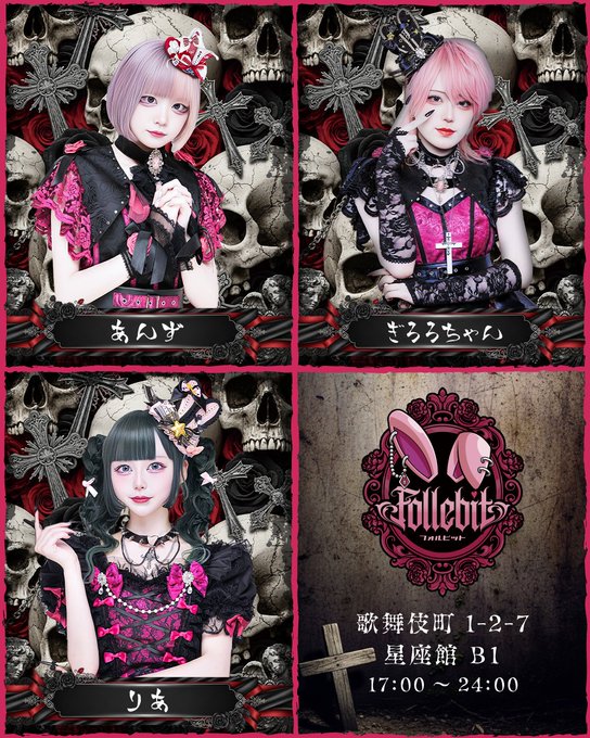 ✟ 𝐅𝐨𝐥𝐥𝐞𝐛𝐢𝐭《フォルビット》 ✟@follebit·🕯𝟏𝟏/𝟐𝟗 (𝒔𝒂𝒕)🕯 さて、今宵の狂兎は✘✘✘ ⛧┈•┈⛧┈•┈⛧ ✟ あんず @46usagi_x ✞ ぎろろちゃん @gilo_follebit ✟ しのあ @4Noqzz ✞ りあ @kil_n_ ✟ みたん @devilnqy ⛧┈•┈⛧┈•┈⛧ #歌舞伎町コンカフェ #新宿コンカフェ #コンカフェ143
