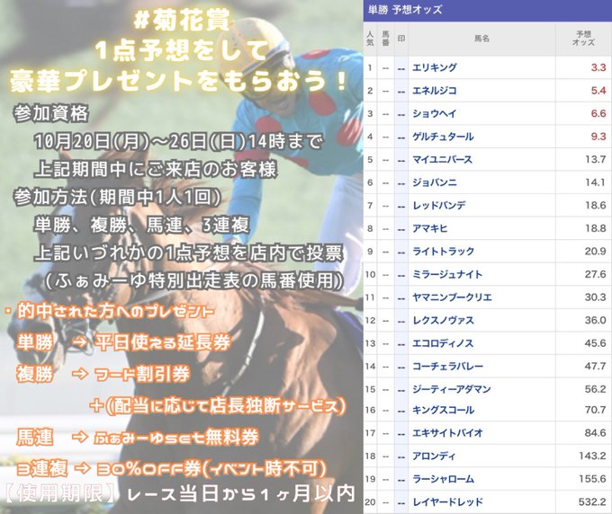 新宿・歌舞伎町 ふぁみーゆ競馬cafe&barふぁみーゆ🐎新宿駅東口から徒歩5分@famille_keiba·🌼#菊花賞 お得イベント🏵️ 🗓️10/22(水)〜 【豪華特典 】 ①🍙自家製お米でおにぎり ②➕京つけもの大安の漬物をサービスします✨ 🗓️10/20(月)〜 🎁菊花賞の1点予想をして豪華プレゼントをもらおう🎁 週末のG1に向けて、一緒に盛り上がりましょう! ご来店お待ちしてます🫶15240