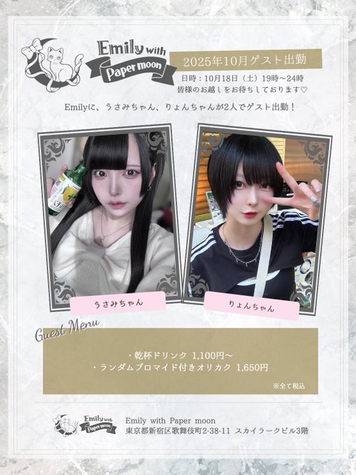 新宿・歌舞伎町 Emily with Paper moon🌕Emily with Paper moon🌕【コンカフェ】新人キャスト募集中🐱@emily_papermoon·🌕🩵𝔼𝕞𝕚𝕝𝕪 𝕨𝕚𝕥𝕙 ℙ𝕒𝕡𝕖𝕣 𝕞𝕠𝕠𝕟🩵🌕 オープンしてます🐈⬛🐾 本日うさみちゃん&りょんちゃんゲスト出勤😽🎶 ⏰19:00~24:00⏰ 🎀💎出勤キャスト💎🎀 うさみちゃん👸(@maid_usami ) りょんちゃん👸(@ryon_gyodon) あや🐈⬛@E__ayachan こやま🐈⬛@kym_404 19:30~ まよ🐈⬛@mayOdayo_oさらに表示381,361