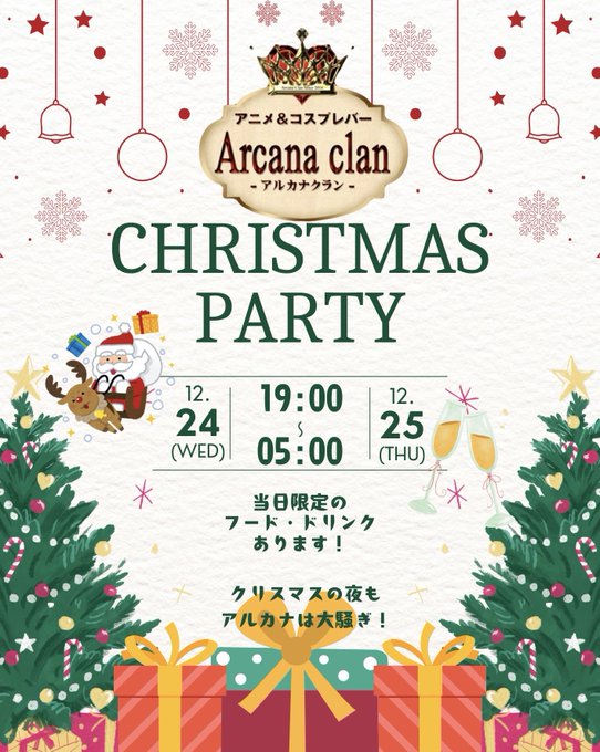 中野・吉祥寺 アニメコンセプトバーArcana Clanりん@arcana_Rin_X·53分みんなでクリスマス盛り上がりましょう“ᕕ( ˙꒳˙)ᕗ,,引用高円寺アニメバー👑アルカナクラン👑@arcana_clan·11時間🎄🫎重大メリメリ告知🫎🎄 シャンシャンシャンシャン‼‼ アルカナクランにも~…! ハッピーメリメリXmasが~…!! く る ぞ ~ ‼‼‼‼‼ 24日㈬、25㈭の2日間開催決定🎁🌃 両日ともにかわいいサンタ達がお出迎え🤲🏻💖 限定フードは毎年大好評のXmasプレート!(予定)さらに表示33