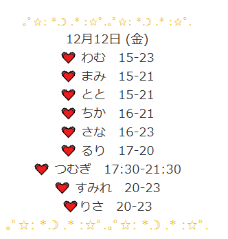 中野・吉祥寺 樂園(パライソ)樂園-パライソ-高円寺平成コンカフェ@paraiso__koenji·12/12 金曜日🩷 18時オープン! 出勤キャスト☆*。 🐶凪@inu____kaitai 18- 🐬いくら@nyqncosusi 18- 😈さたん@satan0509 19- 🥷忍@shinobu_paraiso 19.5- 23.5 応援はこちら📣✊ http://paraiso2023.base.shop 早割18:00-19:00です💘 #コンカフェ #高円寺 #メイドカフェ13273