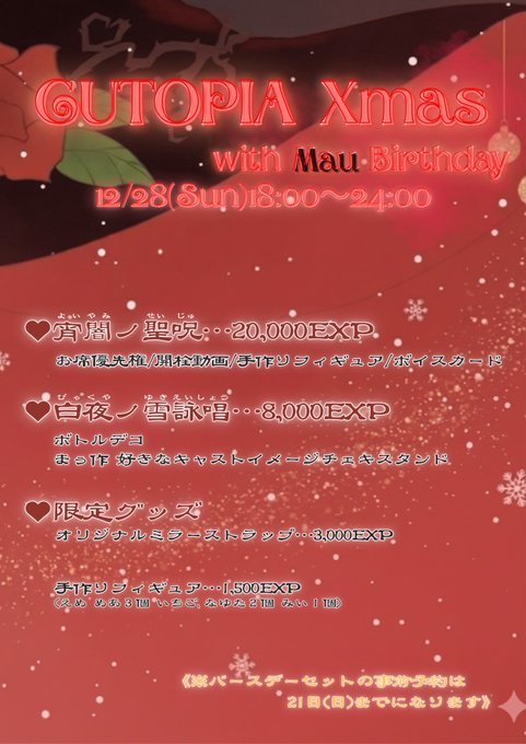 西東京 CUTOPIA エリア2.5DAREA2.5D CUTOPIA@MACHIDA_CUTOPIA·🦌CUTOPIA Xmas🎄 〜withまぅBirthday〜 12/28(日) 18:00~24:00 まぅBDセット21日まで店頭とオンラインで事前予約受付中です👾 まぅ手作りフィギュア、ミラーはここでしかGETできないのでぜひGETしてね🫶🏻 #きゅぴあ14116