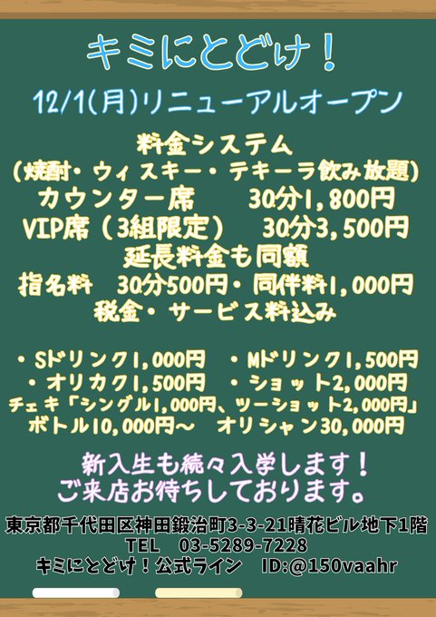 中野・吉祥寺 AngelDreamめるてぃさんがリポストコンセプトカフェ&ラウンジ キミにとどけ!@kimi2todokeeeee·12月1日本日からリニューアルオープン❣️ ぜひみなさまのご来店お待ちしております👩🏻🎓🫶🏻引用コンセプトカフェ&ラウンジ キミにとどけ!@kimi2todokeeeee·11月10日お知らせ🎤 12/1(月曜)キミにとどけ!はリニューアルオープンします🌟 11/29(土曜)までは今のシステムでご案内いたします。 リニューアルに伴い新入生も続々入学予定🔰 ご来店お待ちしております💖2552