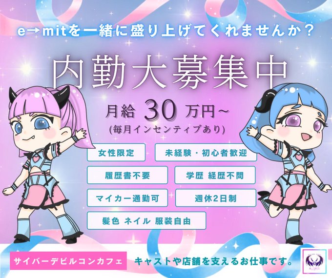 中野・吉祥寺 e→mit⟬吉祥寺コンカフェ⟭ - ̗̀𖤐 e→mit(えみっと)⚡️@emit____lilili·😈━━━━━━━━━━━━━━ 女性内勤スタッフ大募集中! ━━━━━━━━━━━━━━━⚡️ ✅会計、店舗管理など ✅TikTokやXなどのSNS更新 難しい業務はないので未経験でもOK! 🩷🩷 応募はDM又はLINEまで!↓ http://line.me/ti/p/3CxI-SYZBT 🩷🩷 #コンカフェ求人 #吉祥寺81
