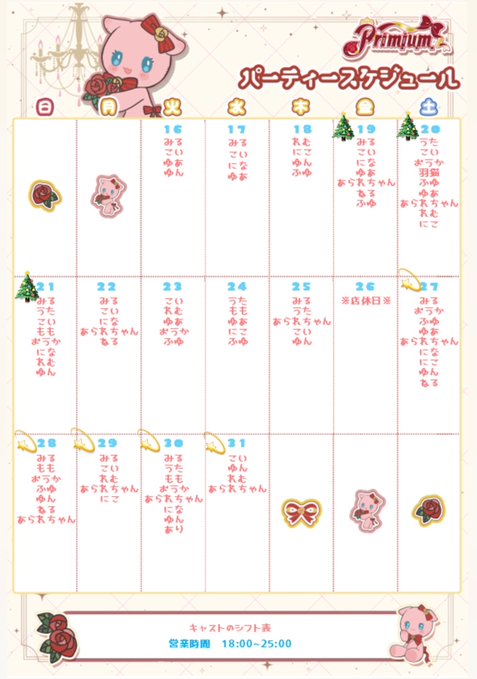 上野・御徒町・湯島・浅草 ぷりみゅーむ🎀Primium(ぷりみゅーむ)🎀上野コンカフェ@Primium_cafe·🌹12月後半パーティースケジュール🌹 🎄19(金)~21(日) クリスマスイベント 💫27(土)~31(水) 年末スペシャル ⚠️26(金)は店休日となります27356
