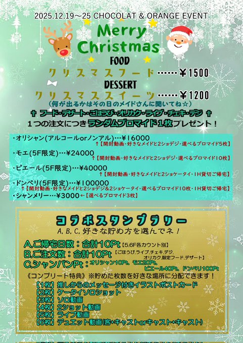 八王子 メイドカフェ&バーChocolatOrangeアニソンバーchocolat八王子♡さんがリポスト八王子メイドカフェバーchocolatOrange♡@orange0827choco·🎄クリスマスイベントのお知らせ✨ 12月19日~25日までクリスマスイベントを開催しておりますー! ハロウィン同様スタンプラリーや期間中に食べれるフードやスイーツもご用意✌️ ご主人様方のご帰宅お待ちしておりますー!✨67113
