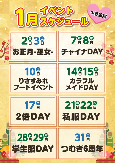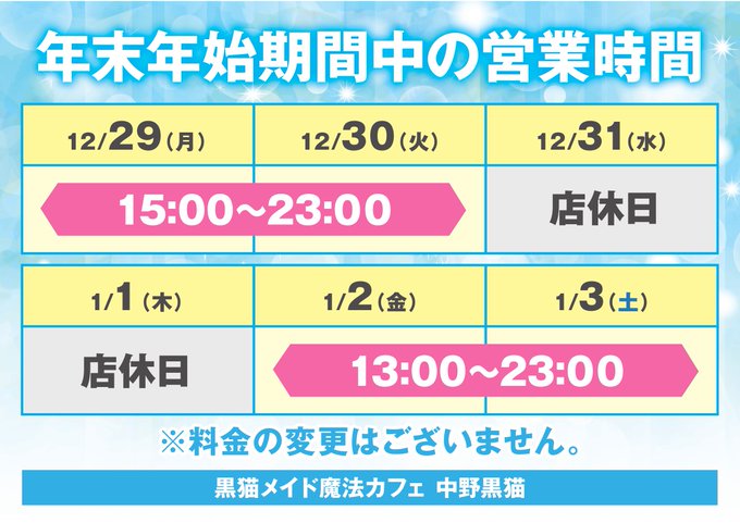 中野・吉祥寺 黒猫メイド魔法カフェ 中野本店KURONECO中野本店@kuroneco_nakano·年末年始の営業時間と 1月・2月イベントスケジュールです!!8192,483