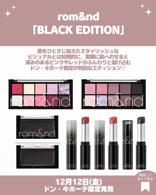 新橋・銀座 めるてぃめるてぃ眼喪・センシティブ・コカヴァエル@memo_ccbm·12月10日病気色ピンク頼む俺のキャンパスで発色してくれ引用kumasaku🐻新作コスメ通販ウォッチャー@CKumacom·12月9日12月12日(金)~順次発売 rom&nd(ロムアンド)/新作コスメ 「BLACK EDITION」ドン・キホーテ限定 ▼詳細情報をLIPSに投稿しました! https://lipscosme.com/posts/821168919859
