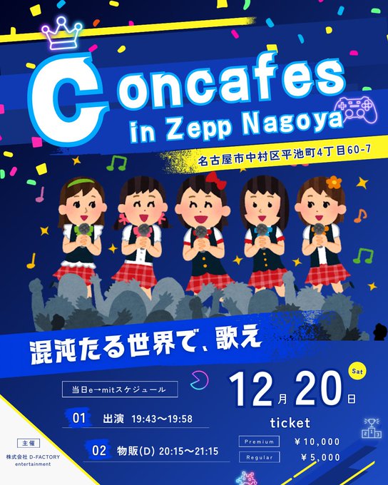 中野・吉祥寺 e→mit⟬吉祥寺コンカフェ⟭ - ̗̀𖤐 e→mit(えみっと)⚡️@emit____lilili·6時間Reino Celeste Presents CONCAFES in Zepp Nagoya なんとe→mitから(ことね、ハルヒ、ひかり、まえだ、夜見)出演させて頂きます‼️✨ 12月20日(土) 11:30 開場 ※ e→mitの出演は19:43~予定😈 終演後物販もあり🌟 詳細は及びチケット購入はこちらから⬇️(下記URL) http://tiget.net/events/447217引用D-FACTORY@d_factory_info·12月2日Reino Celeste Presents CONCAFES in Zepp Nagoya タイムテーブル・チケット情報発表 !! (チケット予約は12月6日18時より予約開始※) ※チケット代金のお支払いは当日となります。 12月20日(土) 11:30 開場 詳細は画像及びTIGET(下記URL)を必ずご覧下さい。 https://tiget.net/events/4472172219