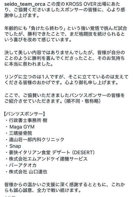 その他東京 コンカフェ・トラウマ 蒲田店でぶす社長@特攻派さんがリポストSEIDO(Yamaguchi)@KINGMASA1·今回、試合用パンツのスポンサーとして支えてくださった皆さまをご紹介させていただきます。 本当に心強い応援をありがとうございました。 このご支援を力に変えて、これからも全力で戦っていきます。でぶす社長@特攻派さんと他3人1624683