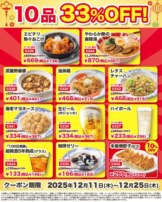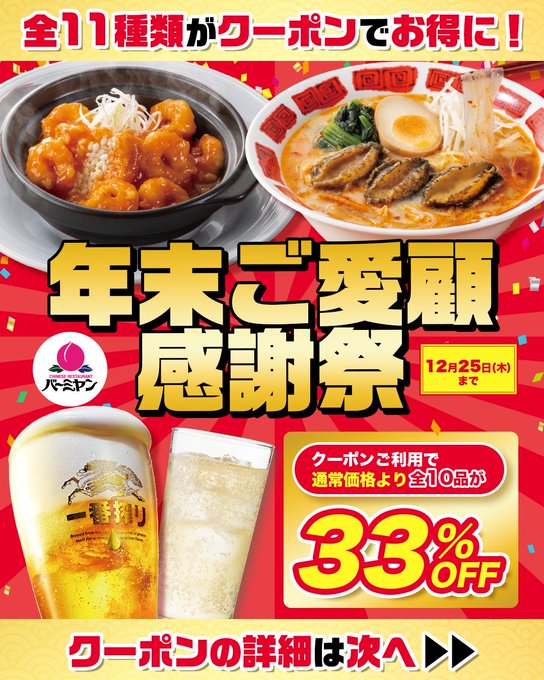 その他東京 コンカフェ・トラウマ 蒲田店🦄どんぐり🦄@dondon_korodon·6時間これはバーミヤン忘年会するしかないじゃん引用正方形のプロフィール画像バーミヤン【公式】@bamiyan_CP·12月11日🎉年末ご愛顧感謝祭🎉 今年最後のお得なクーポンが キタ━━(゚∀゚)━━!!!!🍻✨ クーポンご利用で、 / エビチリ熱々おこげや鮑の麻辣湯など 全10種が 3⃣3⃣%OFF!!! \ クーポンは12/25(木)まで何度でも使えるので、 忘れずに保存してね🍑 クーポン番号は2枚目の画像をチェック👇13171