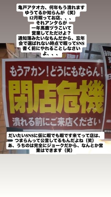 その他東京 コンカフェ・トラウマ 蒲田店でぶす社長@特攻派@wakeariran·亀戸アタオカ、何年もう潰れますゆうてるか知らんが(笑) 12月暇ってお店、、、 それアンタらが 一年馬鹿ヅラこいて 営業してただけよ? 通知簿みたいなもんだから、忘年会で選ばれない時点で暇ってSNS書く前にやれることしなさいよ、、、 だいたいSNSに仮に暇でも暇です来てっ...1145