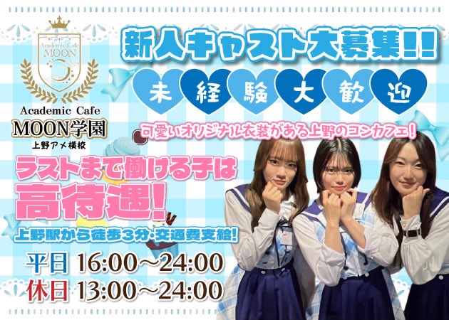 上野・御徒町・湯島・浅草 アカデミックカフェMOON学園 上野アメ横校固定Academic Cafe MOON学園 上野アメ横校@moonuenoameyoko·Academic Cafe MOON学園 上野アメ横校では随時キャスト募集中🎀 給与 時給1,500円~+各種バックあり 応募条件(18歳~25歳の女性(高校生不可) ⭐️ステージあり🎤 🤍当校だけのオリジナル曲あり♪♪🤍 🤍交通費支給🤍 🤍ラストまで働ける方優遇🤍 お問い合わせ、ご応募は当アカウントのDMまで194
