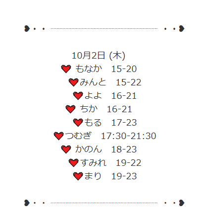 固定10/3リアバの夜見(よみ)🌙e→mit@yomi_devichan·10月前半ログイン表!! リアバ月間なのでよろしくお願いします|ω•)チラッ #コンカフェ営業 #コンカフェ6112