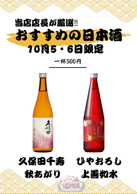 競馬カフェ&バー🐴オリエンス💛 JR錦糸町駅南口から徒歩6分🐴✨@keiba_oriens·✨10月5・6日限定✨ ・久保田 千寿 秋あがり ・ひやおろしの上善如水 一杯500円🍶354