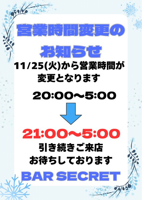 その他東京 ダーツ&カラオケバー シークレット固定ダーツ&カラオケバー「シークレット」@ojikibar_secret·【営業時間変更のお知らせ】 11/25(火)より営業時間が変更となります。 20:00〜5:00 ⬇️ 21:00〜5:00 新しいスタッフも加わって盛り上がる事 間違いなし!💪 引き続き皆様もご来店楽しみに お待ちしております☺️ #バー #ダーツ #カラオケ #飲み放題 #ボードゲーム #テキーラ #東陽町 #江東区43725