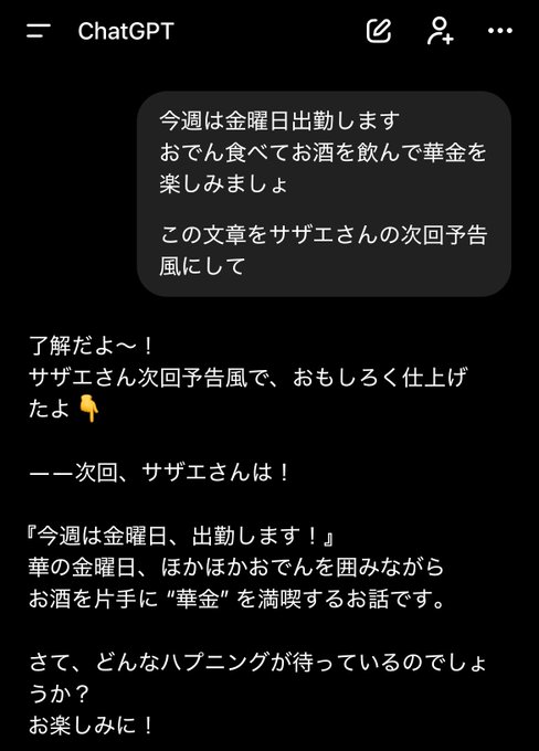 その他東京 コンカフェ・トラウマ 蒲田店固定🦄どんぐり🦄@dondon_korodon·――次回、サザエさんは! 『今週は金曜日、出勤します!』 華の金曜日、ほかほかおでんを囲みながら お酒を片手に “華金” を満喫するお話です。 さて、どんなハプニングが待っているのでしょうか? お楽しみに! #蒲田 #せんべろ #おでん #飲み放題 #日本酒 #サザエさん【蒲田】トラウマfeaturing SANDAIME Kamata【朝7時まで営業】1493