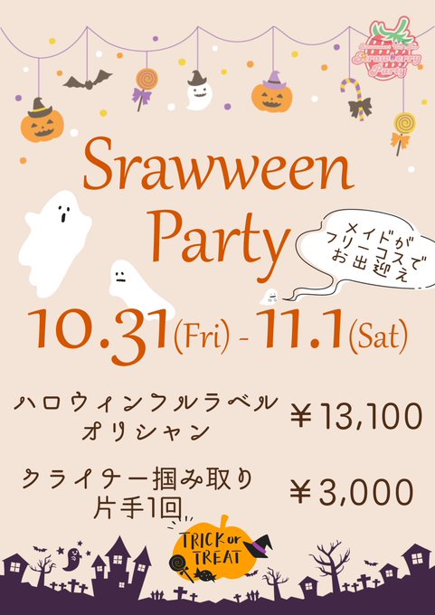 固定国分寺StrawberryParty🍓@strawberry2f·【 𝑬𝒗𝒆𝒏𝒕 】 🎃Straween Party🎃 🍬10/31(金)-11/1(土) 🕸ハロウィン限定フルラベルオリシャン 🦇クライナー掴み取り開催 当日はメイドちゃんがフリーコスでお出迎えします🕷️ 乾杯できなきゃイタズラするぞ👻🍭1132