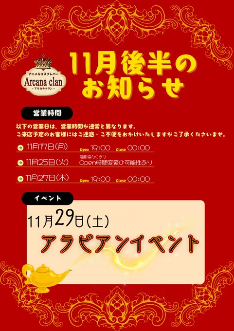 中野・吉祥寺 アニメコンセプトバーArcana Clanりんさんがリポスト高円寺アニメバー👑アルカナクラン👑@arcana_clan·🐫アルカナクラン 11月後半のおしらせ🐫 11月後半の営業時間をお知らせいたします。 ご来店予定のお客様につきましては、ご不便をおかけし申し訳ございません🙇🏻♀️ 11月29日(土)はアラビアンイベント!🍹🌙 妖艶…煌びやか…異国の夜に迷い込んだような雰囲気を楽しんでください!✨さらに表示34288