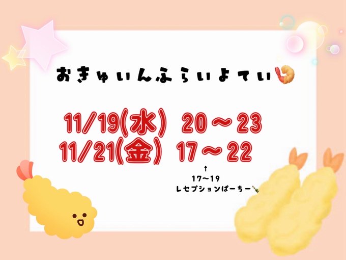 固定えびふらい@ebifurai_kmmm·今週のおきゅいんふらい予定🍤❣️ 11/21(金)17.5〜19 はクラファン支援者様限定で『新衣装レセプションパーティー』になります‼️ みんなで出航ふらい〜🚢❣️2233