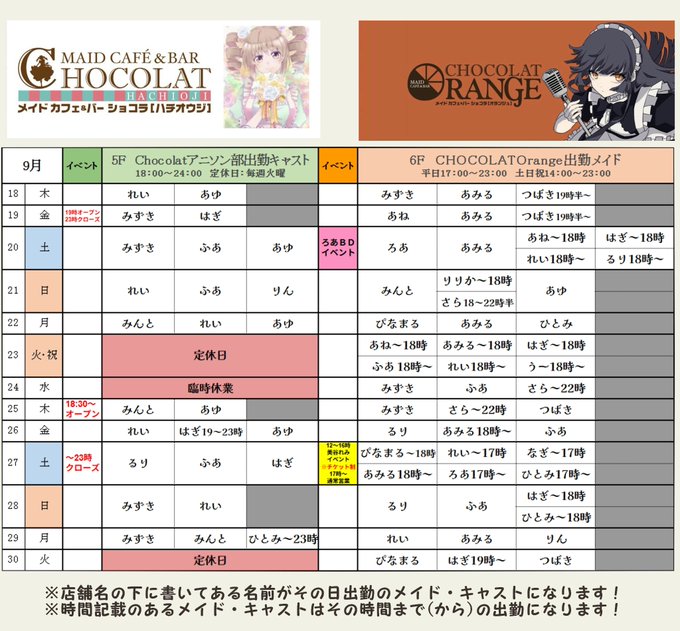 固定アニソンバーchocolat八王子♡@chocolatCafeba1·5時間更新しました!引用八王子メイドカフェバーchocolatOrange♡@orange0827choco·5時間【お給仕予定 更新🌟】 9月もご帰宅お待ちしております❕ #メイド #メイドカフェ #コンカフェ #八王子 #飲み放題4162