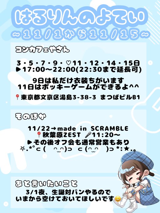 上野・御徒町・湯島・浅草 可茶菓茶‐ぷりてぃぱーてぃ‐水鈴遥(すいりん はるか)🍣@suirin0u0haruka·11月12日あちたもまってるからね♡引用水鈴遥(すいりん はるか)🍣@suirin0u0haruka·11月5日【11月前半】 ⚠️8日ではなく9日に変更です!イベントではないですが私だけ衣装ちがうよ😏水色お姫様大臣😏 🍵@prethe_parthe 🕵🏻♀️一旦見てねhttp://instabio.cc/4032901qS0Boc 😳ほぼ毎日配信中http://17.live/s/u/582ffe0e-0… ☺️チェキツイなどタグ #水鈴遥を推すしぐみ お給仕リクエスト日あればDMください🫶🏻18763