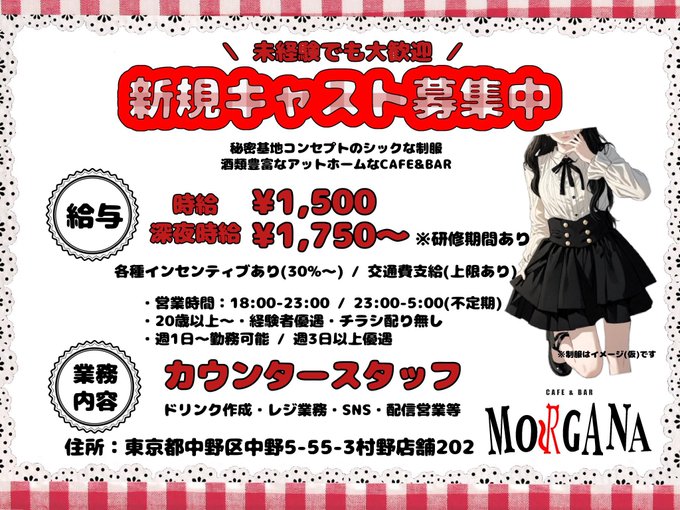 中野・吉祥寺 CAFE & BAR MORGANACAFE & BAR MORGANA 🐈⬛ 中野コンカフェ@MORGANA_nakano·CAFE & BAR MORGANA オープンしました🐈⬛ ⏰11/10 18:00-23:00 こはる。 ( @niconi_586 ) ありさ ( @sakezako__arisa )-22 わか ( @Wakachanhai )20.5- 本日もご来店・遠隔オーダーお待ちしております🌼 遠隔オーダーはこちら ▷ http://morgana0315.base.shop #コンカフェこはる。24480