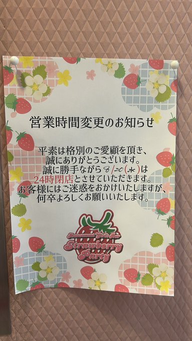 国分寺StrawberryParty🍓@strawberry2f·本日24時までの営業となっております😖3221