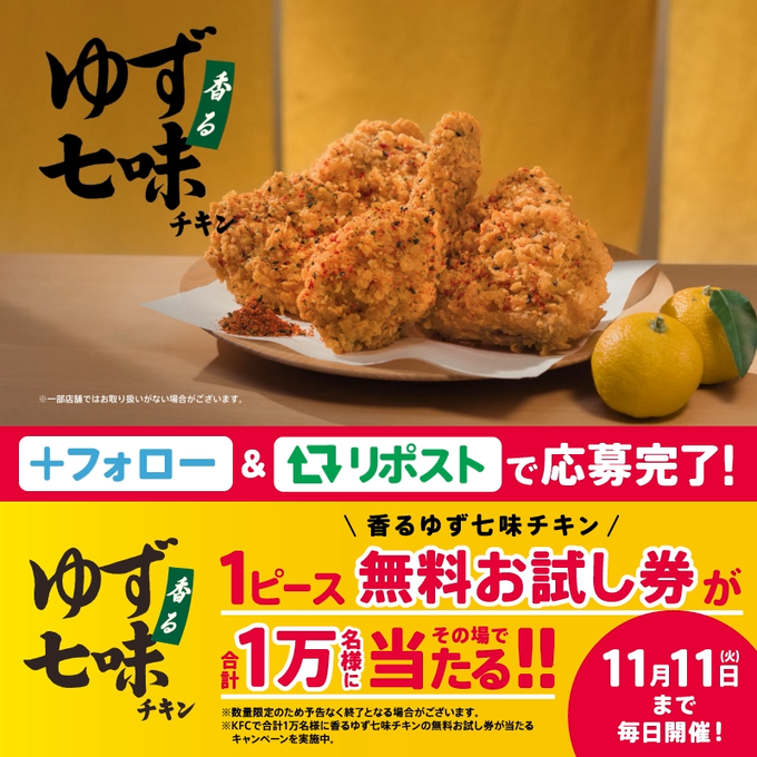 中野・吉祥寺 アニメカフェ ハニスタ㋩㋥㋜㋟ 🌟さんがリポスト正方形のプロフィール画像ケンタッキーフライドチキン🍗@KFC_jp·/ 本日(水)から 【香るゆず七味チキン】新発売🎊 \ 発売を記念して 抽選で合計【1万名様】に1ピース無料お試し券をプレゼント🎁 ① @KFC_jp をフォロー ②この投稿をリポストして応募 ③返信で届く動画で結果を確認 【香り高いゆず】を楽しもう🍗0:15kfc.co.jpから39311万3.9万4,290万
