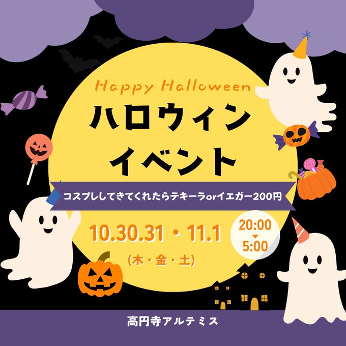 中野・吉祥寺 海の家コンセプト アルテミス💛💙高円寺 アルテミス💙💛@Artemis_kouenji·本日のアルテミス☀️ 元気よくOPEN‼️ ハロウィンイベント🎃コスプレday ⏱20:00-5:00 20:00- るな @luluiui000 21:00- はるか @haruka_no_ 22:00- りと @rito__o1025 ひな @hi7_u_u お待ちしてます23616