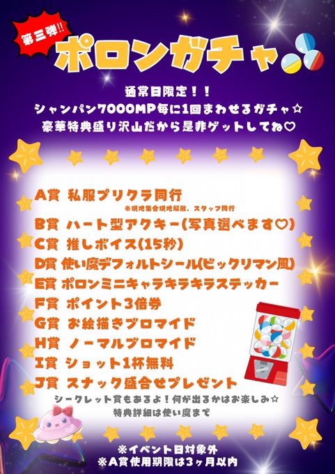 ぱぴぷぺポロン🛸新橋コンカフェ@polon_bar·㈫🛸 大人気‼️ポロンガチャ第三弾好評稼働中💫💫なんと残りわずか😳 ラストワン賞はA4サイズの使い魔サイン入りBIGラミカ💖 スターリーナイトフェスタも貯まります🫶🏻 オフ会参加目指してがんばろー❣️💓 召喚使い魔は しの、おうりん、しゃお、なまはむ、ななや、めぐ、もんちゃん、あむ 🌟さらに表示22377