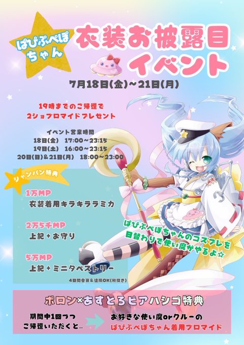 ぱぴぷぺポロン🛸新橋コンカフェ@polon_bar·🌟《㈪》使い魔召喚予定🌟 🩵ぱぴぷぺぽちゃん衣装お披露目🩵イベント✨ いよいよ本日最終日です❣️❣️ ラストはしのちゃんがぱぴぷぺぽちゃんに大変身👾🛸【@polon_shino 】 🍾シャンパン特典も特別✨全使い魔対象ぱぴぷぺぽちゃん衣装着用グッズをご用意🪐さらに表示53999