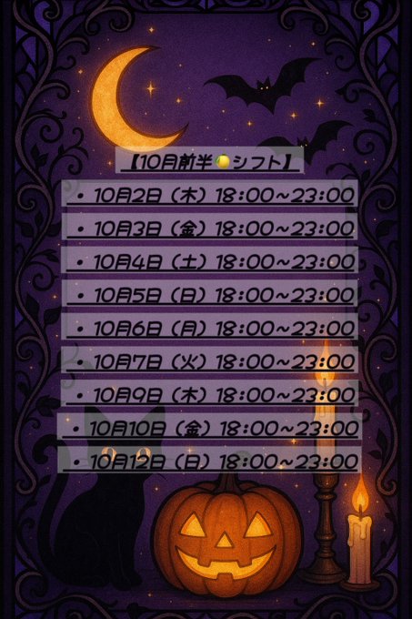 りんさんがリポストもちこ🔰@mochi_Arcana·🎃10月のシフト🎃 今月もよろしくお願いいたします‼️ 未定の日があるので決まり次第また上げるかも⤴︎︎︎⤴︎︎︎⤴︎︎︎16156